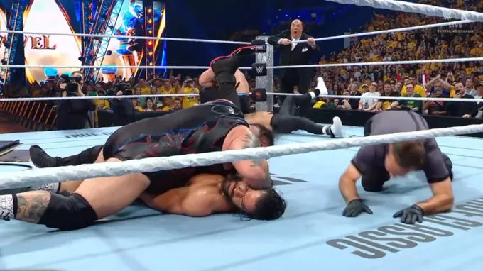 Sin embargo, el caos se desató completamente cuando Jey Uso, intentando ayudar a Roman, terminó lanzándose accidentalmente con una lanza sobre su propio primo, rompiendo una mesa en el proceso. Reed aprovechó la confusión, conectó su devastador Tsunami Splash y cubrió a Reigns para la cuenta de tres, logrando así la victoria más importante de su carrera.