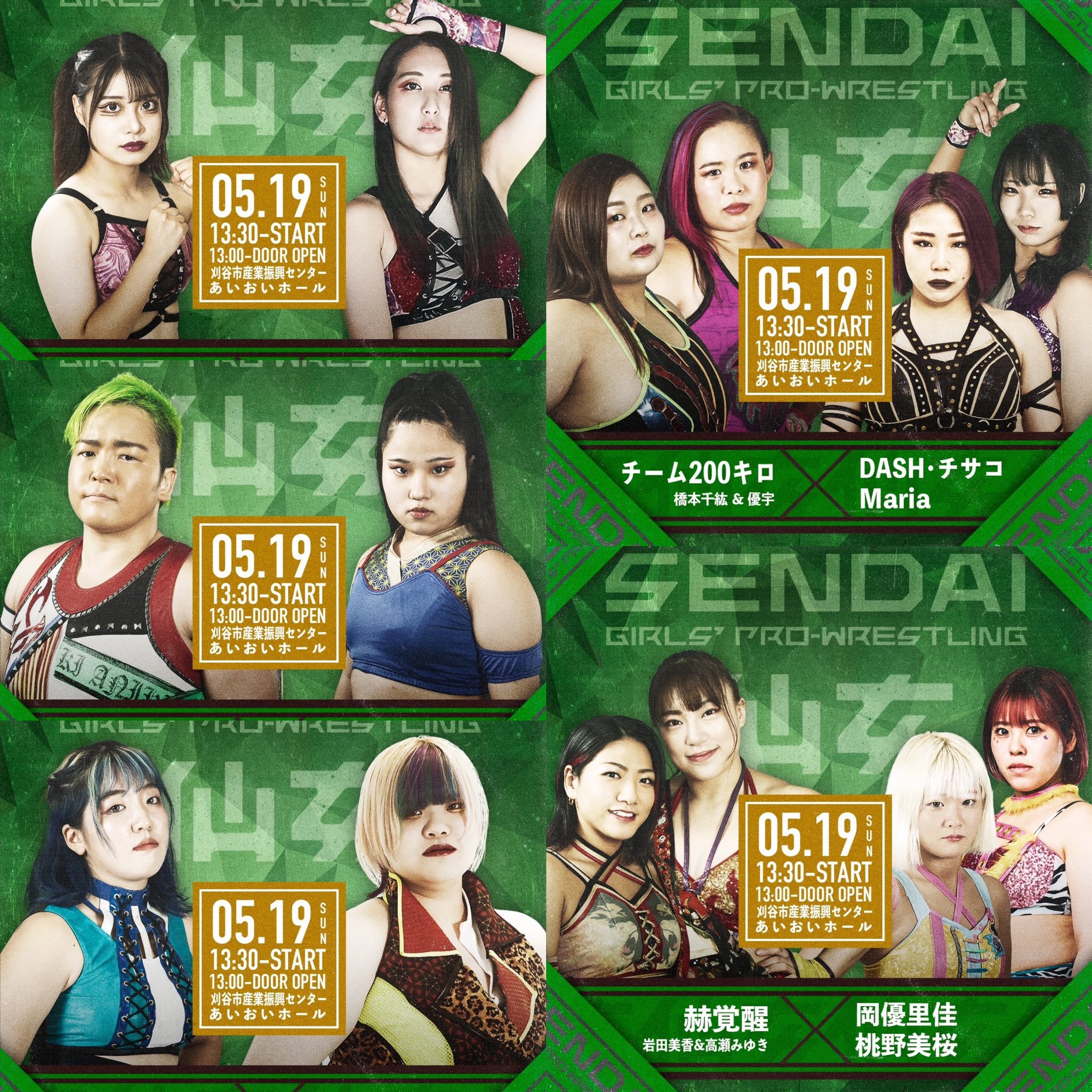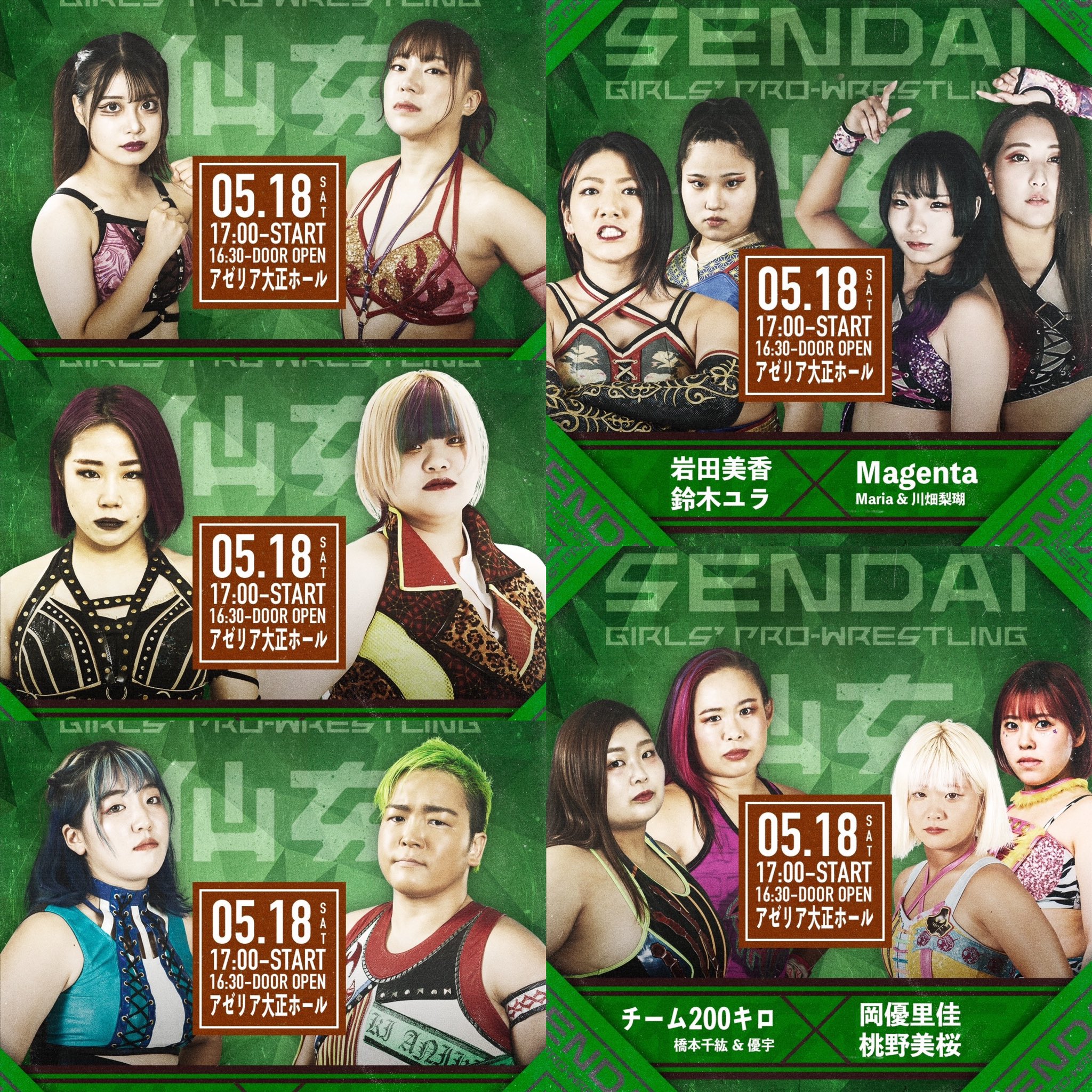 Sendai Girls (SENJO) confirmó la cartelera para sus shows del fin de semana del 18 y 19 de mayo. 5 combates en ambos shows pero con todas las estrellas de la compañía de Meiko Satomura.