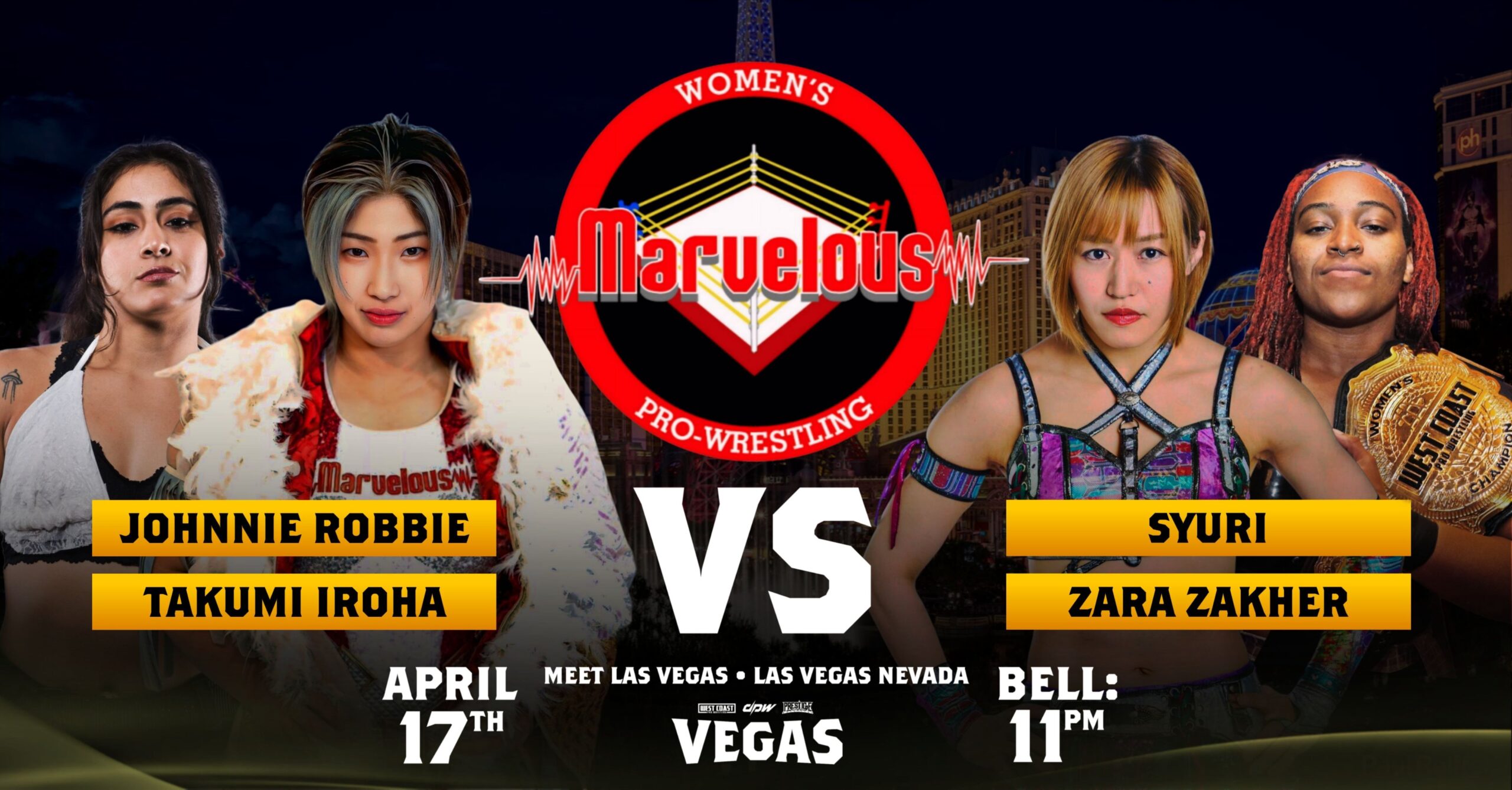 La empresa Marvelous Pro Wrestling confirmó la cartelera para su próximo gran evento MARVELOUS VEGASel 17 de abril en Las Vegas, Nevada. La cartelera contará con talento de STARDOM, AEW y TNA Wrestling. El gran atractivo es la presencia de Syuri en un combate por equipos enfrentando a Takumi Iroha.