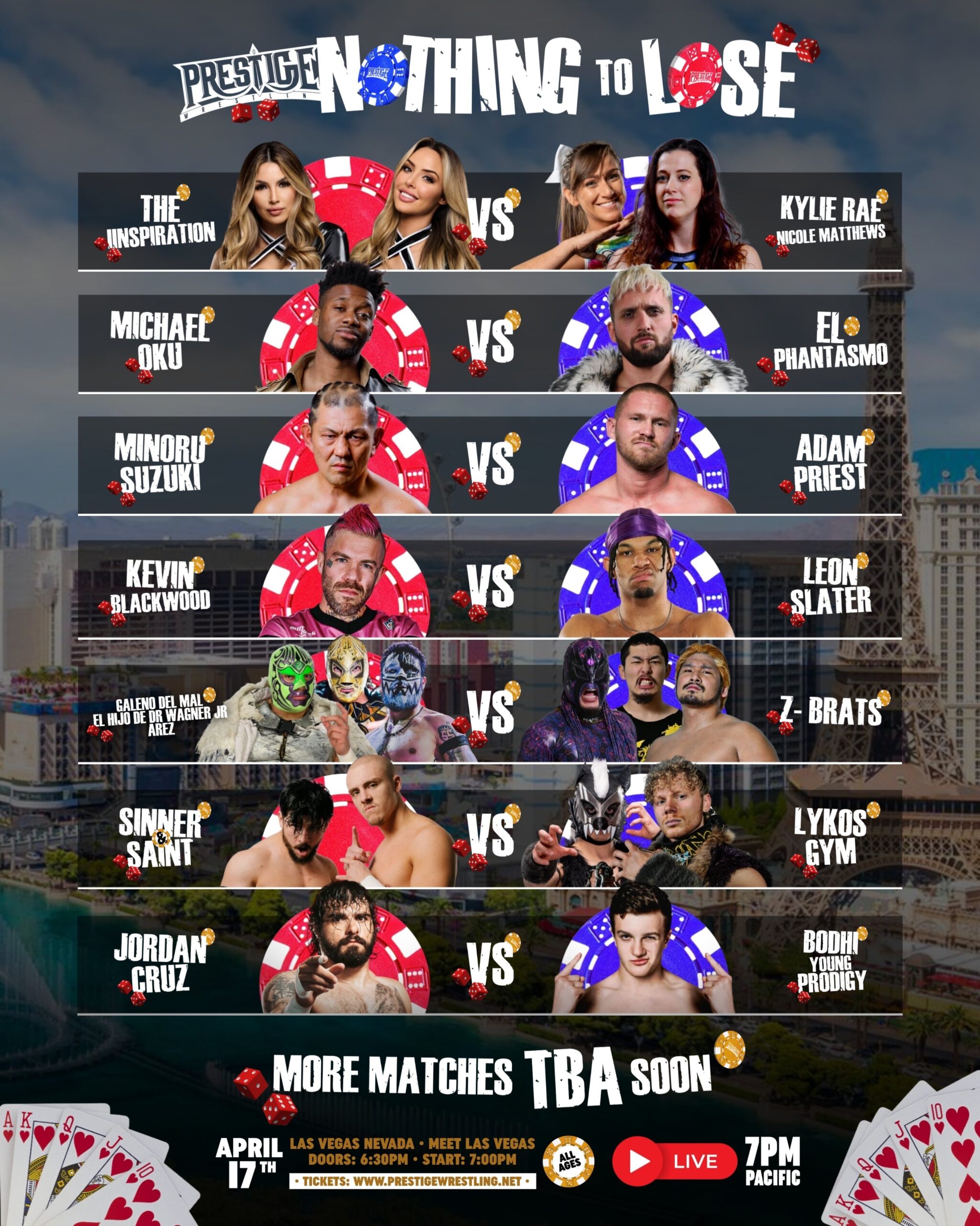 La empresa Prestige Wrestling confirmó la cartelera para su próximo gran evento VEGAS Nothing to Lose el 17 de abril en Las Vegas, Nevada. La cartelera contará con talento de New Japan Pro Wrestling y Pro Wrestling NOAH. Además, el gran atractivo es el primer combate de THE IINSPIRATION desde el 2023.