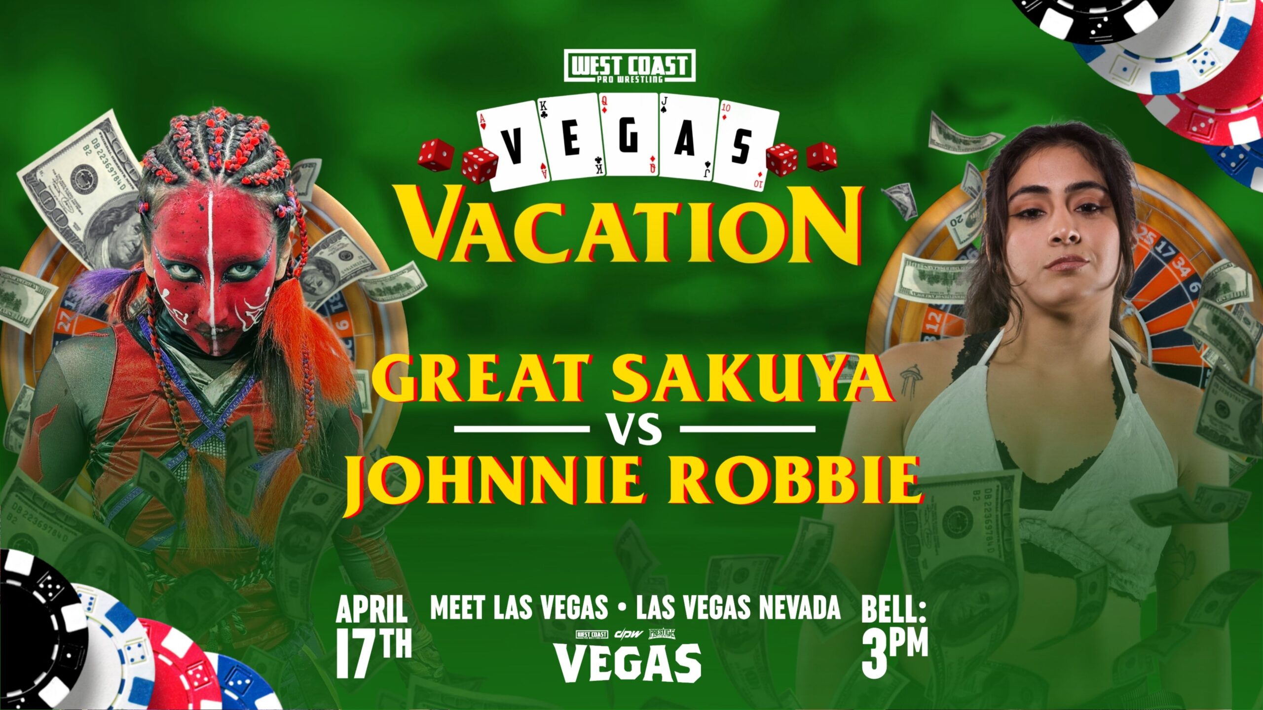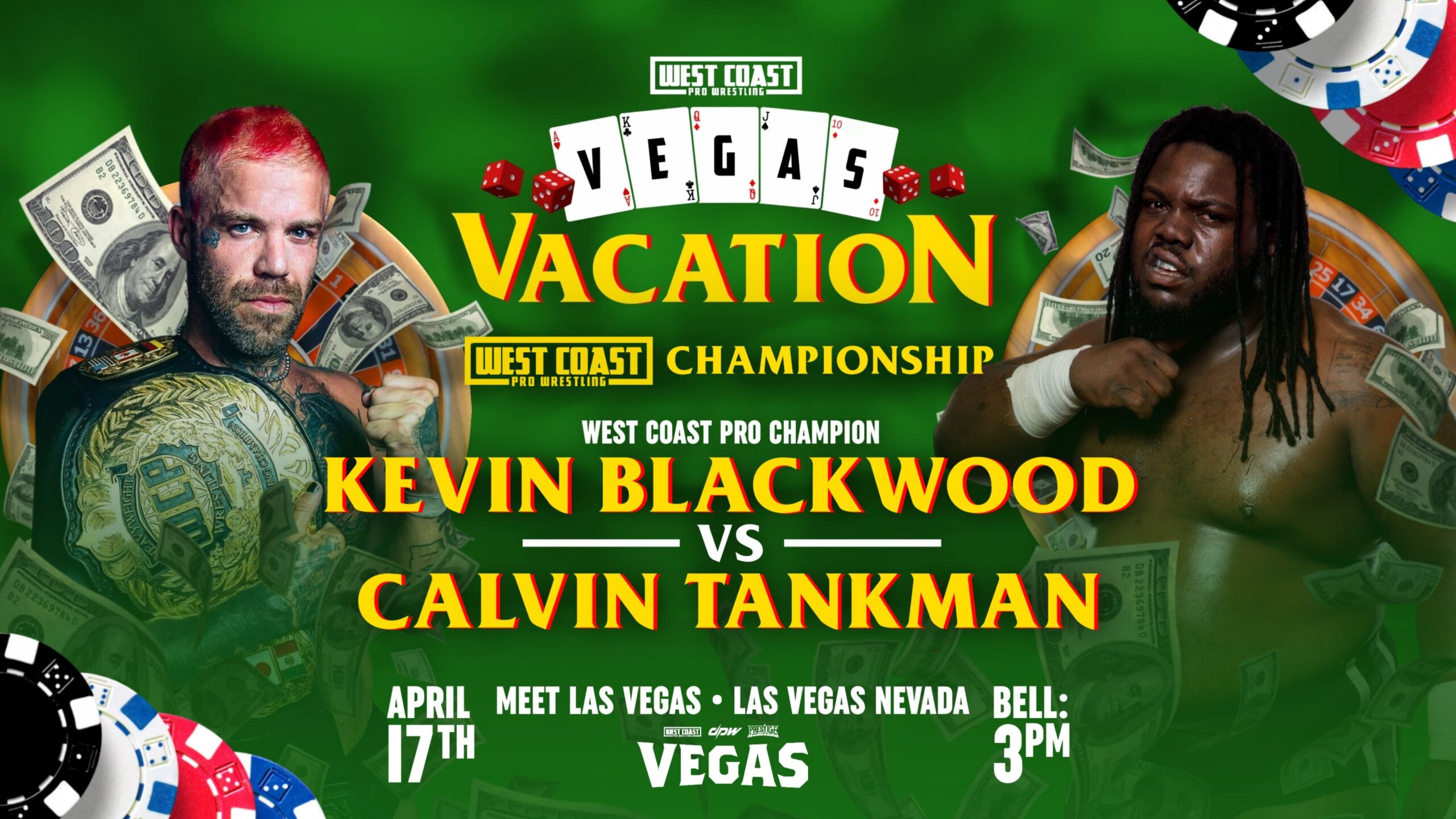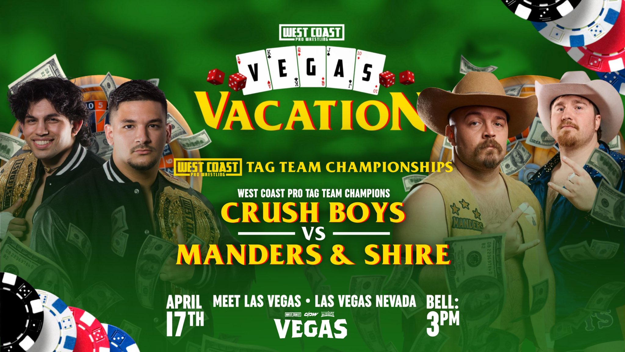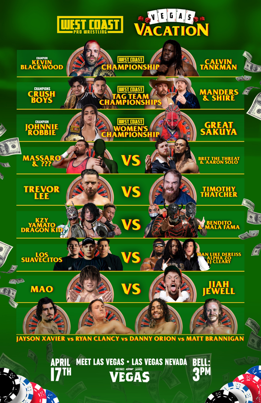 La empresa West Coast Pro Wrestling confirmó la cartelera para su próximo gran evento VEGAS Vacation el 17 de abril en Las Vegas, Nevada. Este será el show de celebración del 25 aniversario de la compañía.