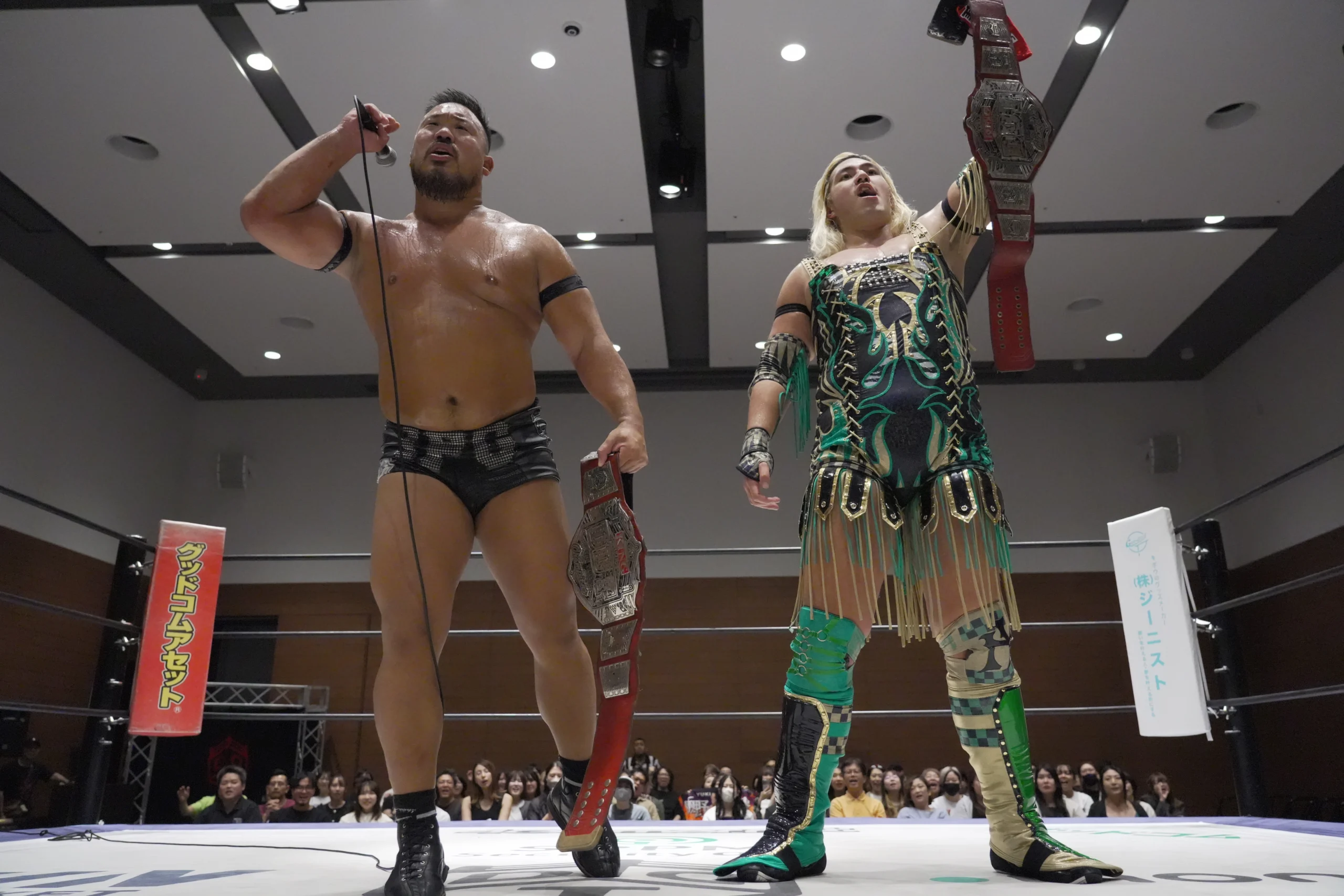 Yuki: The Astronauts are an amazing tag team. They formed the fighting detectives promotion on their own. And they’re really just exciting, very amazing. Abe is very aggressive and Nomura, like every time Abe goes for the offensive, Nomura follows up right after in the same second. So, back then, we just teamed up, we were very fresh, it was a tag team but we didn’t really have much experience with belts. So, I start wondering, like when Naya hit something, I have to follow up and there’s something Naya has to follow up when I’m at the offensive. But, we wanted to show our pride. We were really unsure at the first point, but, with our strength, we were able to surpass the Astronauts. We really liked the Astronauts and I feel that they are one of the most exciting tag teams in all of Japan.