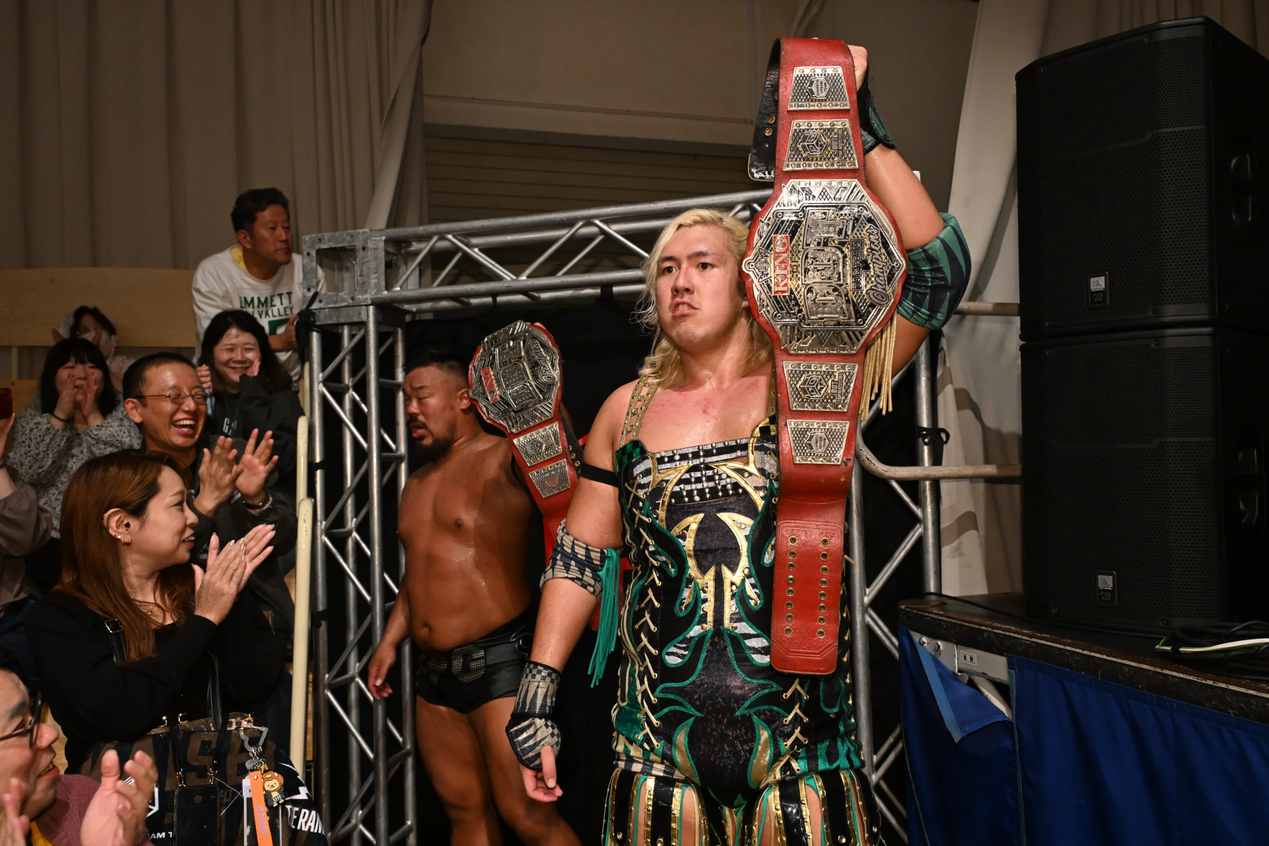 Yukio: I felt like we won because we were a better tag team, because Harashima san and Aoki san are not really a normal tag team on regular shows. So, we really showed our strength as a tag team compared to two very strong single wrestlers that were a team for the time being. Obviously, Aoki san and Harashima san are amazing wrestlers. Especially for, like, Aoki, he’s very good at showing his technique. Obviously, in terms of strength, The Apex are stronger, but in every other aspect, in the wrestling ring, he really knows how to attack us on our weak spots and everything. The second we just lose sight of him for a second, he’ll get an arm or a leg and lock us into a submission, and that’s what makes Aoki san very scary.