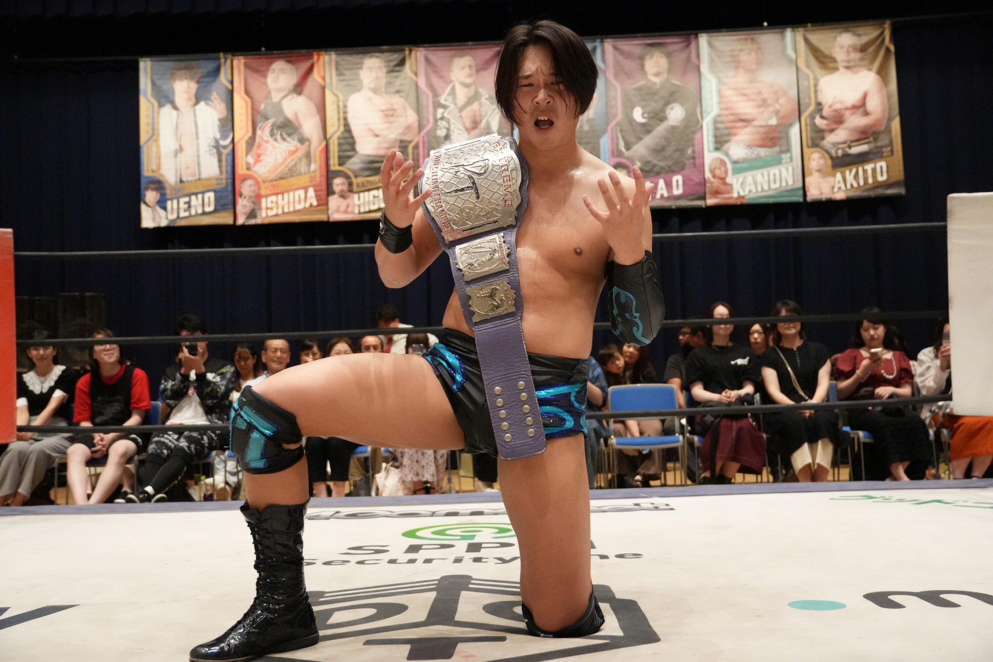 To-y: He competido por otros cinturones. Competí por el título Universal y otros títulos en DDT. Pero el primero que gané como título individual fue el Extreme. Así que me di cuenta de que, hasta ahora, mi estilo de lucha, incluyendo el combate explosivo y otros combates interesantes, era el más cercano al Extreme. Claro, antes de desafiar a Super Sasadango Machine, él tuvo un combate interesante con Toru Yano en el Korakuen Hall, y justo después de ese combate, yo también lo desafié. Sentí algo de presión al entrar en el combate. Pero llegué con una especie de estado zen, sin presión ni agobios. Estaba intentando ganar de verdad y, de alguna manera, conseguí el cinturón.