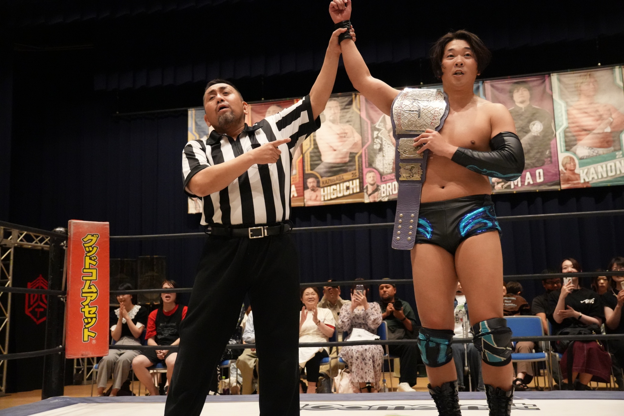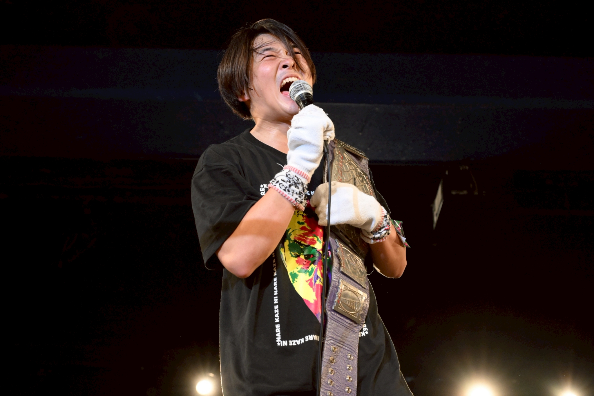 To-y: Ganar los cinturones por parejas de Asia en el combate con alambre de púas fue especial. Antes solo veía combates con alambre de púas en televisión. Y pude formar equipo con Onita-san, una de las leyendas del combate a muerte con alambre de púas. Y la gente decía cosas cuando sucedía el combate. Pero durante el combate con alambre de púas, había algo de miedo. Así que el miedo estaba ahí, pero gracias a ese combate superé el miedo. Ahora no siento miedo cuando subo al ring. Así que, gracias a ese combate, realmente me ayudó a ganar confianza en el ring. Y además, creo que esos cinturones por parejas son de los más antiguos de la lucha libre profesional en Japón. Así que estoy muy contento de haberlo ganado con Onita-san.