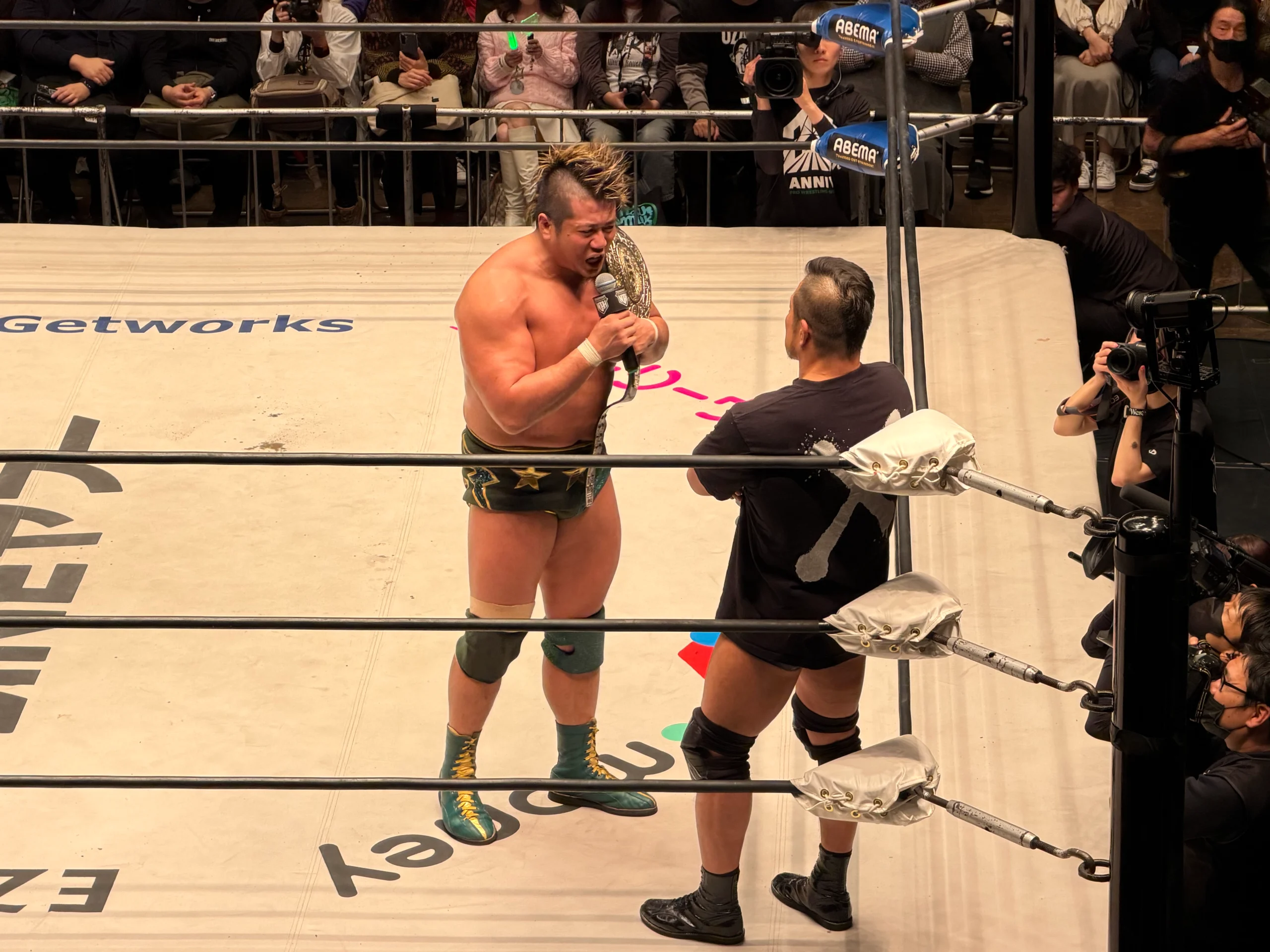 BUSHI「チャンピオンとして正々堂々挨拶させてもらったよ。タイトルマッチの前哨戦として、6人タッグやりましょうよ。それとHAYATA、このシリーズどこかでシングルマッチやろうぜ。俺はお前に借りがあるんだ。今日は調印式がわりに挨拶させてもらったから」#noah_ghc pic.twitter.com/fvNqPYxG6e