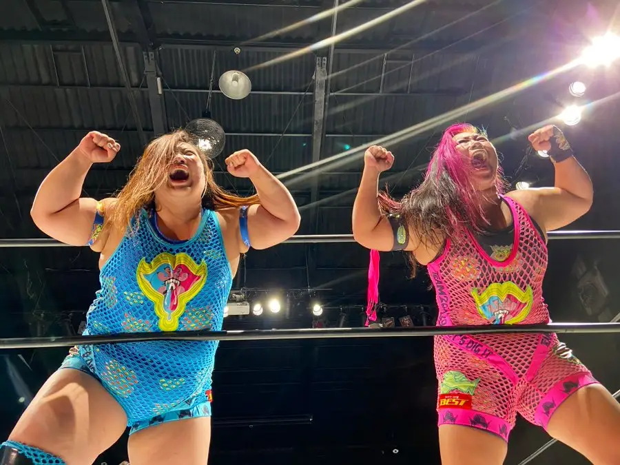 En los combates de parejas, la leyenda Aja Kong se unió a VENY para derrotar a Mika Iwata & Yurika Oka en 13:23 minutos, mostrando poderío, coordinación y ataques combinados que dominaron a sus rivales. Por otro lado, Team 200kg (Chihiro Hashimoto & Yuu) venció a Ryo Mizunami & Spike Nishimura en 12:35 minutos, con movimientos potentes y una estrategia bien ejecutada que cerró la jornada con gran intensidad.