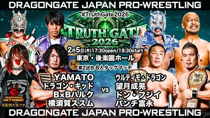 Dragon Gate celebró el DG Truth Gate 2026 – Día 1 el 5 de febrero de 2026 desde el mítico Korakuen Hall de Tokio, ante 1.142 espectadores y con transmisión en directo a través de Dragon Gate Network. El evento marcó el inicio oficial de una de las giras más importantes del calendario de la empresa japonesa, con múltiples rivalidades avanzando y varios finales polémicos.