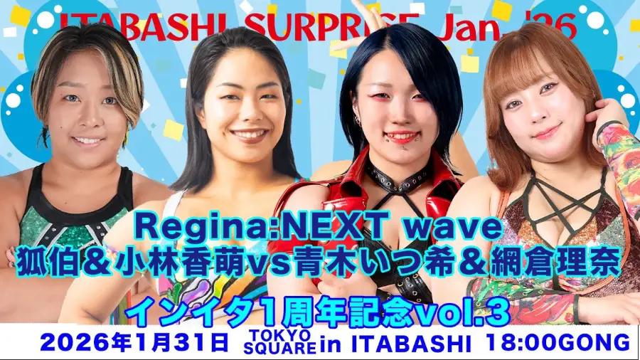 La empresa Pro Wrestling WAVE presentó el evento Itabashi Surprise January 2026 el pasado 31 de enero de 2026 desde el TOKYOSQUARE In Itabashi de Tokio, ante una asistencia de 105 aficionados. El show ofreció una cartelera variada, combinando combates individuales, luchas múltiples y enfrentamientos por equipos que mantuvieron un ritmo sólido de principio a fin.